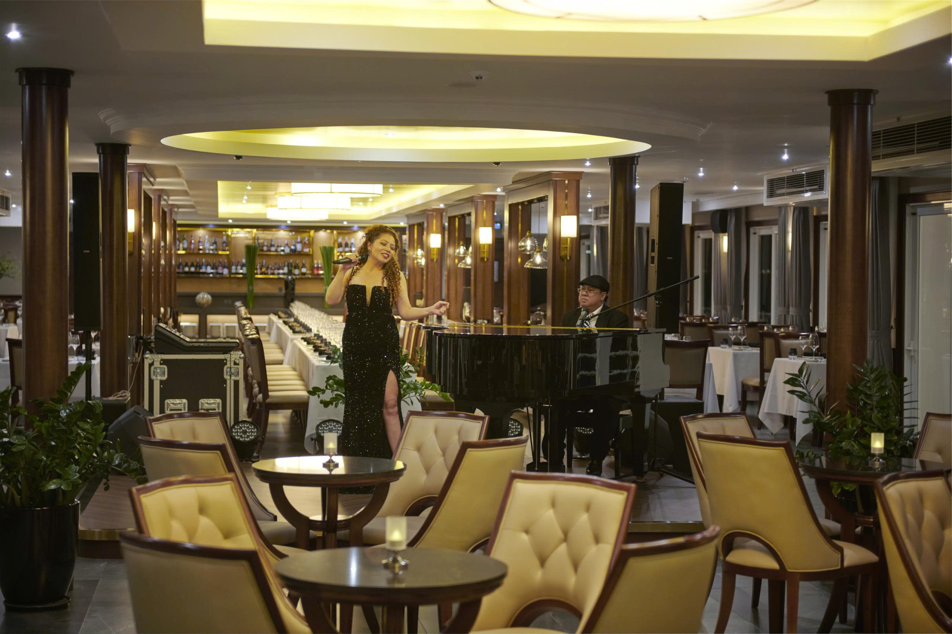 19:00 - 20:30 Quý khách trải nghiệm trang phục áo dài ngũ thân và thưởng thức bữa tối À La Carte thượng hạng tại nhà hàng Elegance trên Du thuyền.