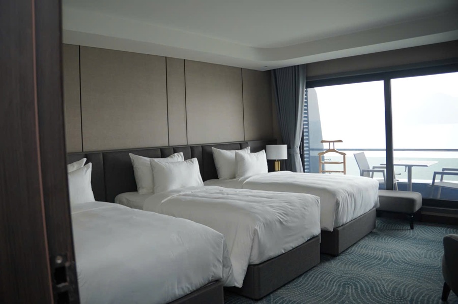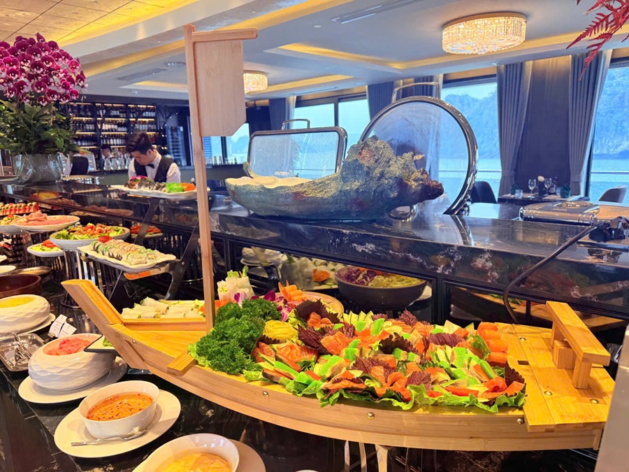 Ngay sau đó là bữa trưa phong phú chuẩn Á – Việt, được phục vụ trong không gian nhà hàng sang trọng, nơi du khách có thể ngắm toàn cảnh vịnh với các điểm nhấn như hòn Con Rùa hay hòn Đầu Người.